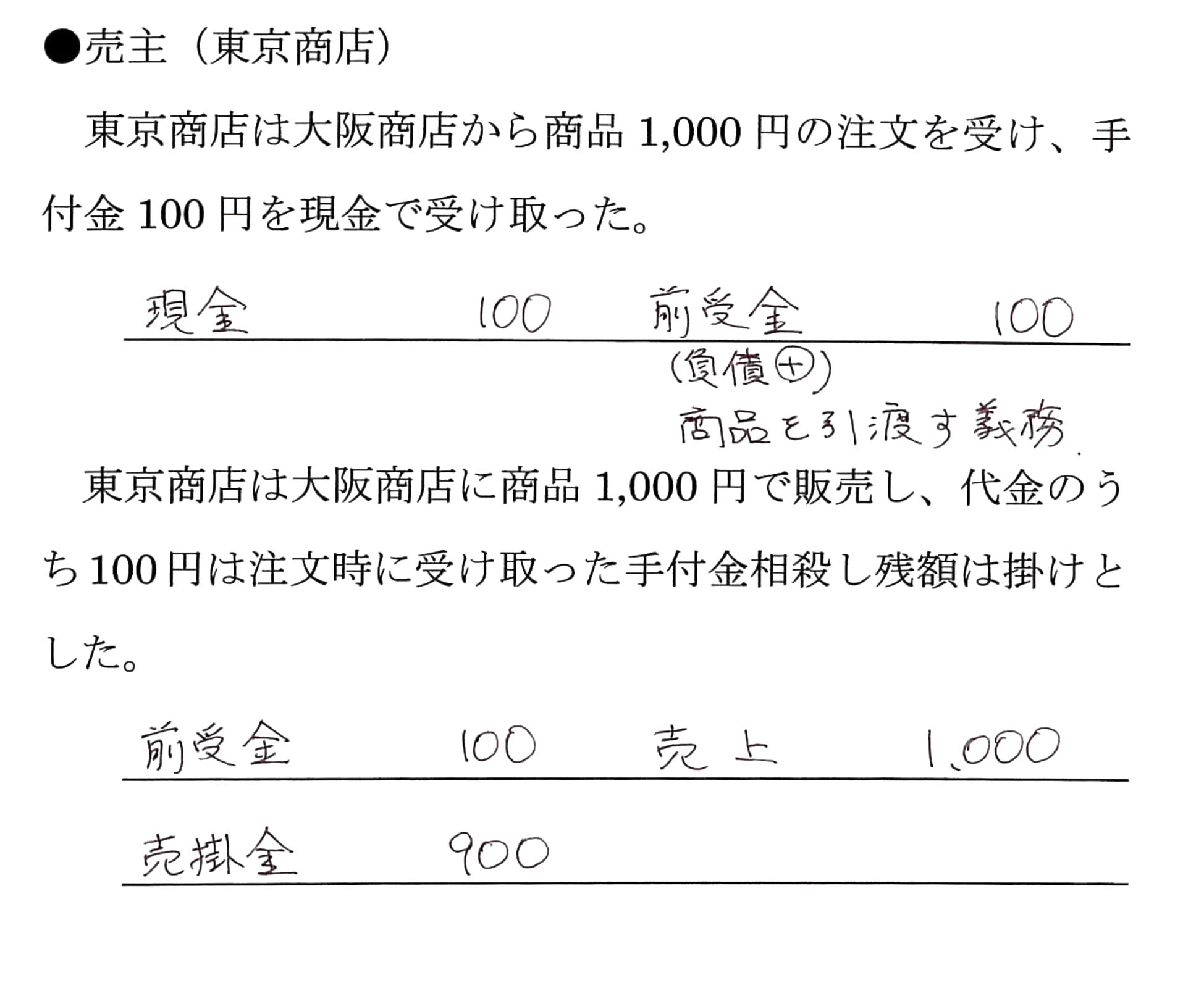 3.得意先梅田商店から商品¥300,000の注文を受け、代金のうち¥100,000を小切手で受け取った。