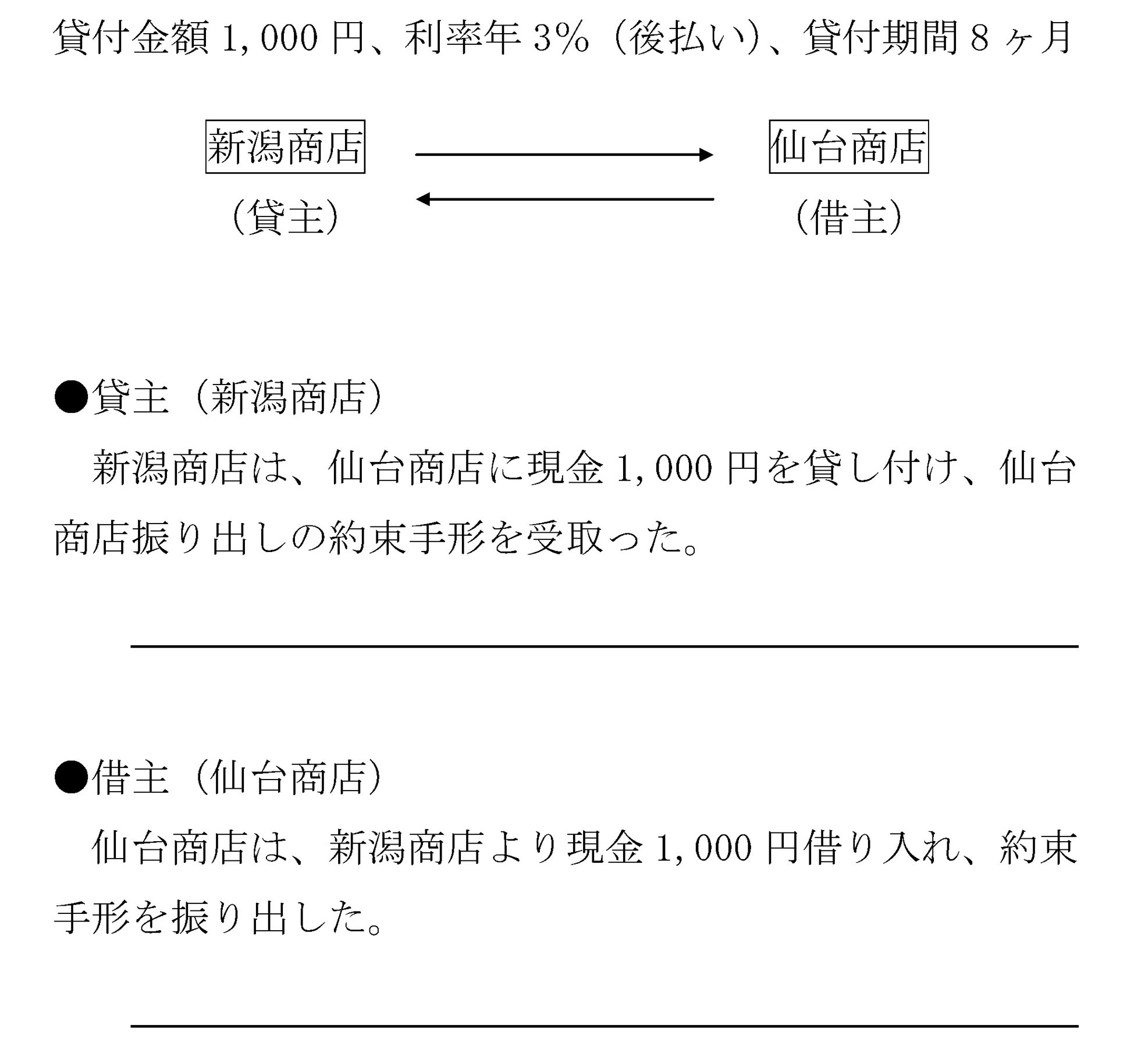1.西宮商店から頼まれて¥500,000を貸し付けた。利息は年6%、貸付期間4カ月で、利息分を差し引いた残額を現金で渡した。