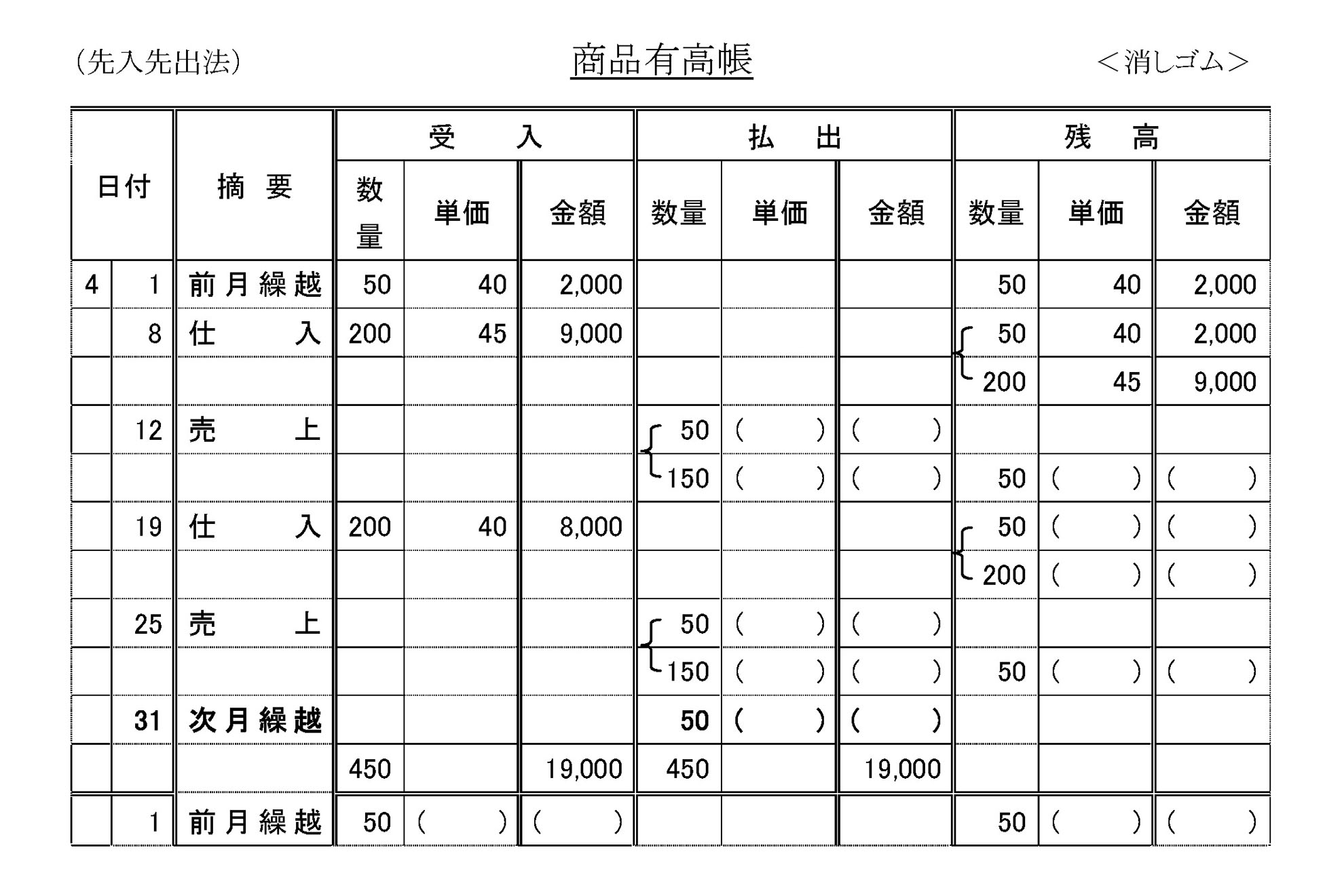 次に示す取引を参考にして、4月中の消しゴムの商品有高帳を先入先出法で記入しなさい。
