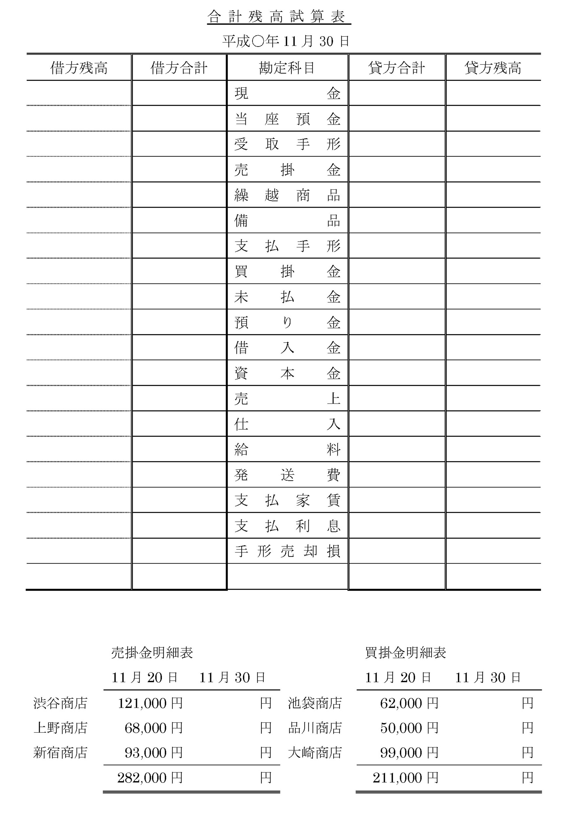 次の合計試算表(資料1)と各取引(資料2)にもとづいて、答案用紙の月末の合計残高試算表と売掛金および買掛金の各明細表を作成しなさい。なお、仕入と売上はすべて掛けで行っている。