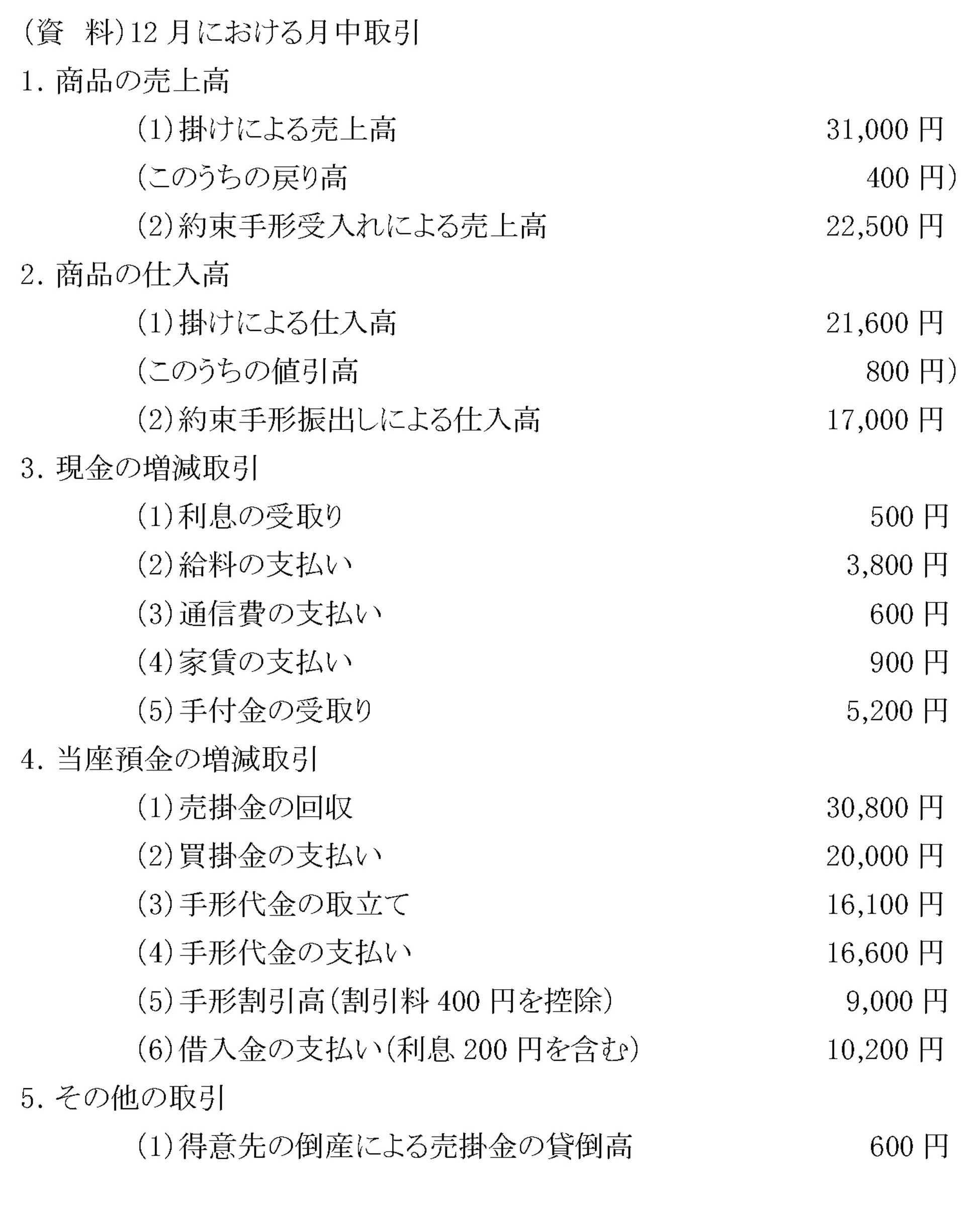 答案用紙の合計残高試算表に記載されている12月の月初繰越高と下記の資料にもとづいて、12月末における合計残高試算表を作成しなさい。