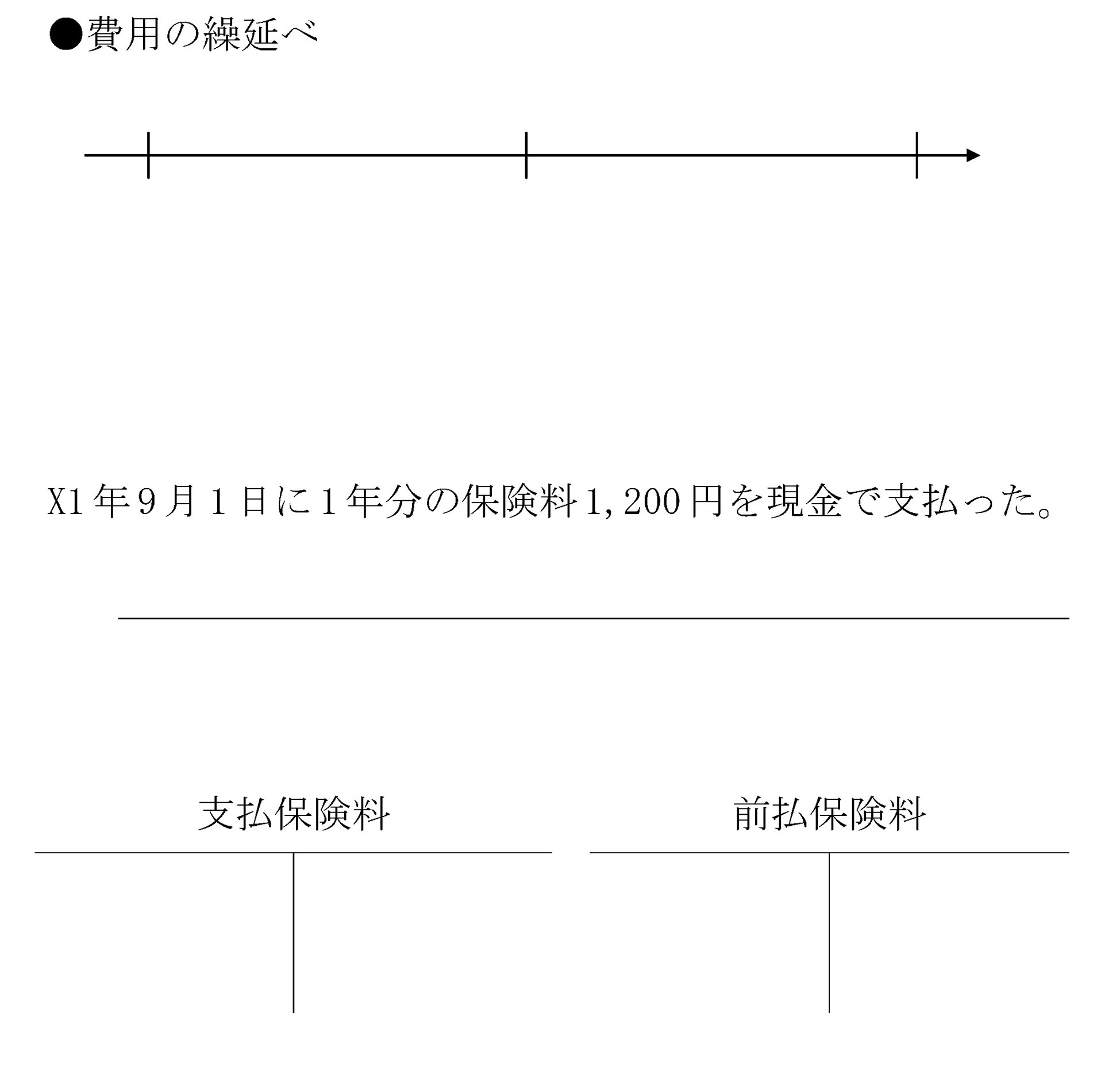 当期中の6月1日に1年分の損害保険料2,400円(@200円×12カ月)を現金で支払っており、決算における修正仕訳を行う。(決算:年1回、12月31日)