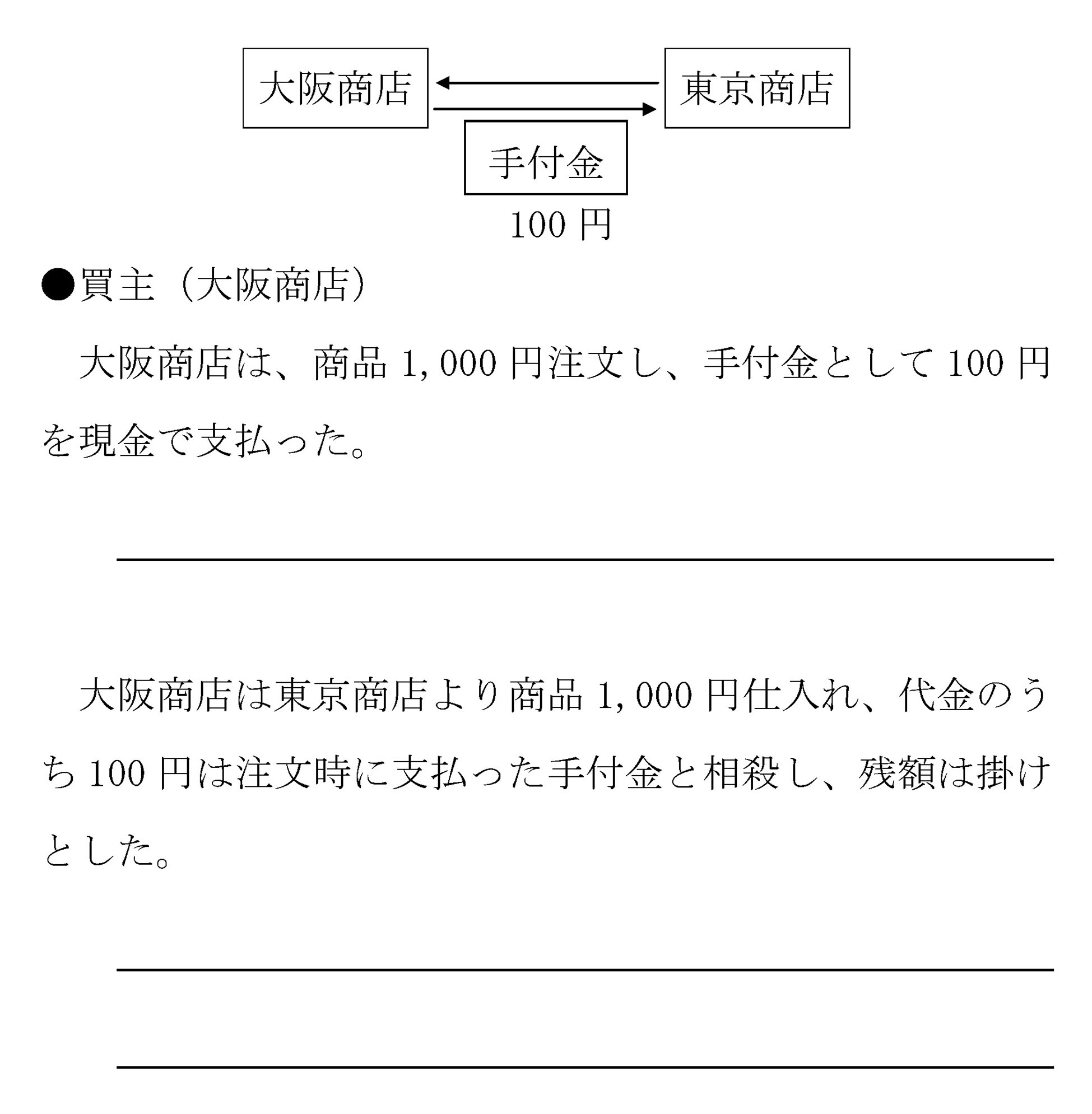 1.三宮商店へ商品500,000円を注文し、内金として100,000円を現金で支払った。
